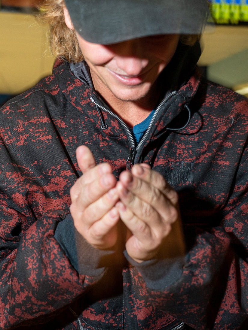 Part of our collaborative capsule with the Dustbox crew, this mid-weight work jacket with cozy Tafetta lining, moisture-shedding non-fluorinated DWR coating, and custom interior screen print artwork is a staple piece with a subtle look for morning walks, afternoon sessions, and night missions alike.