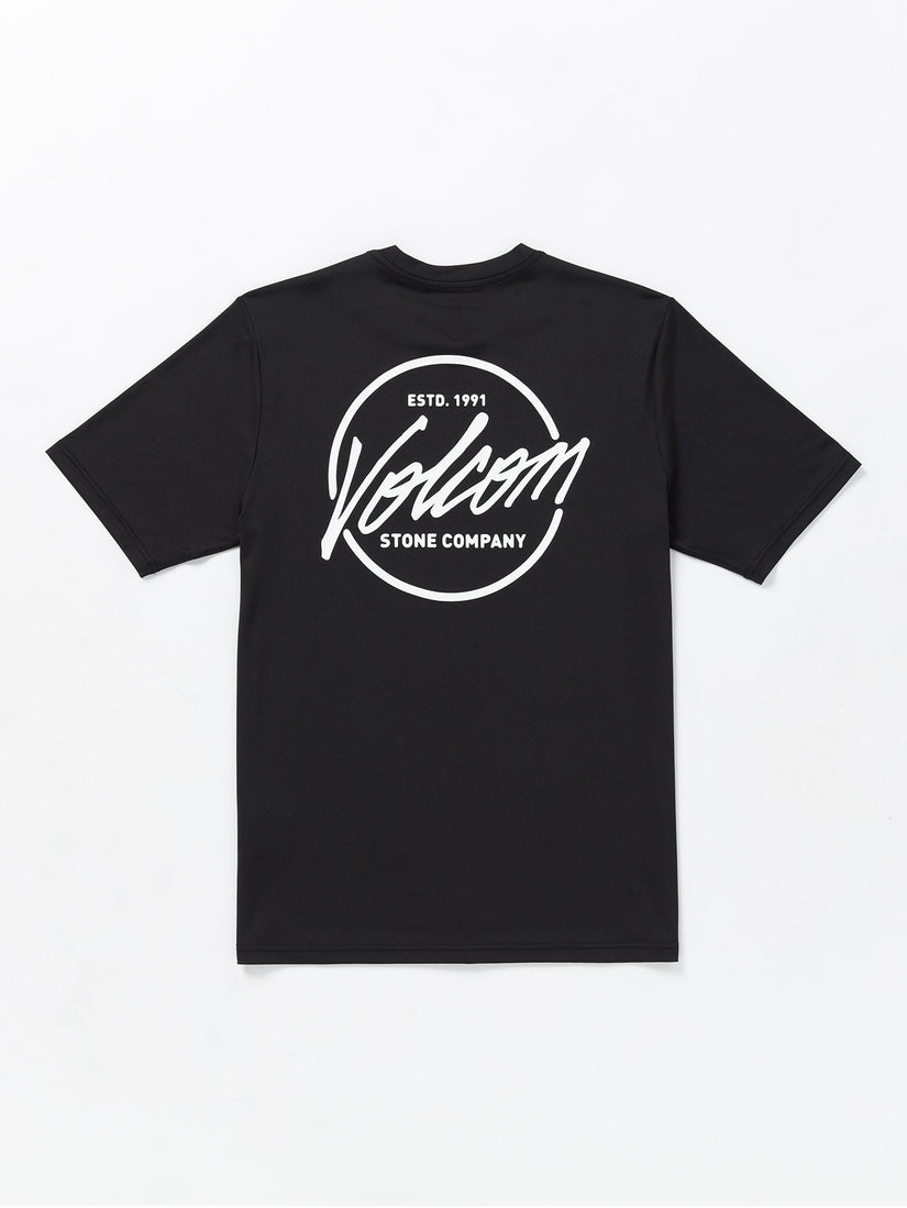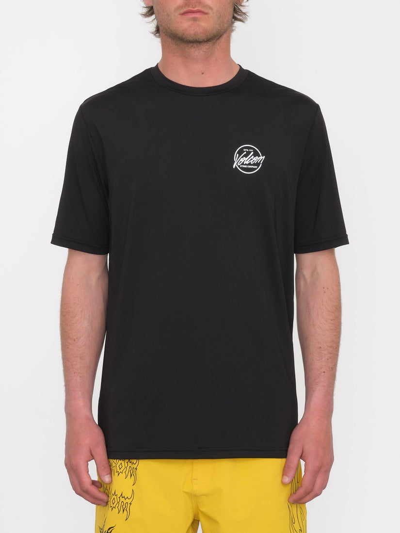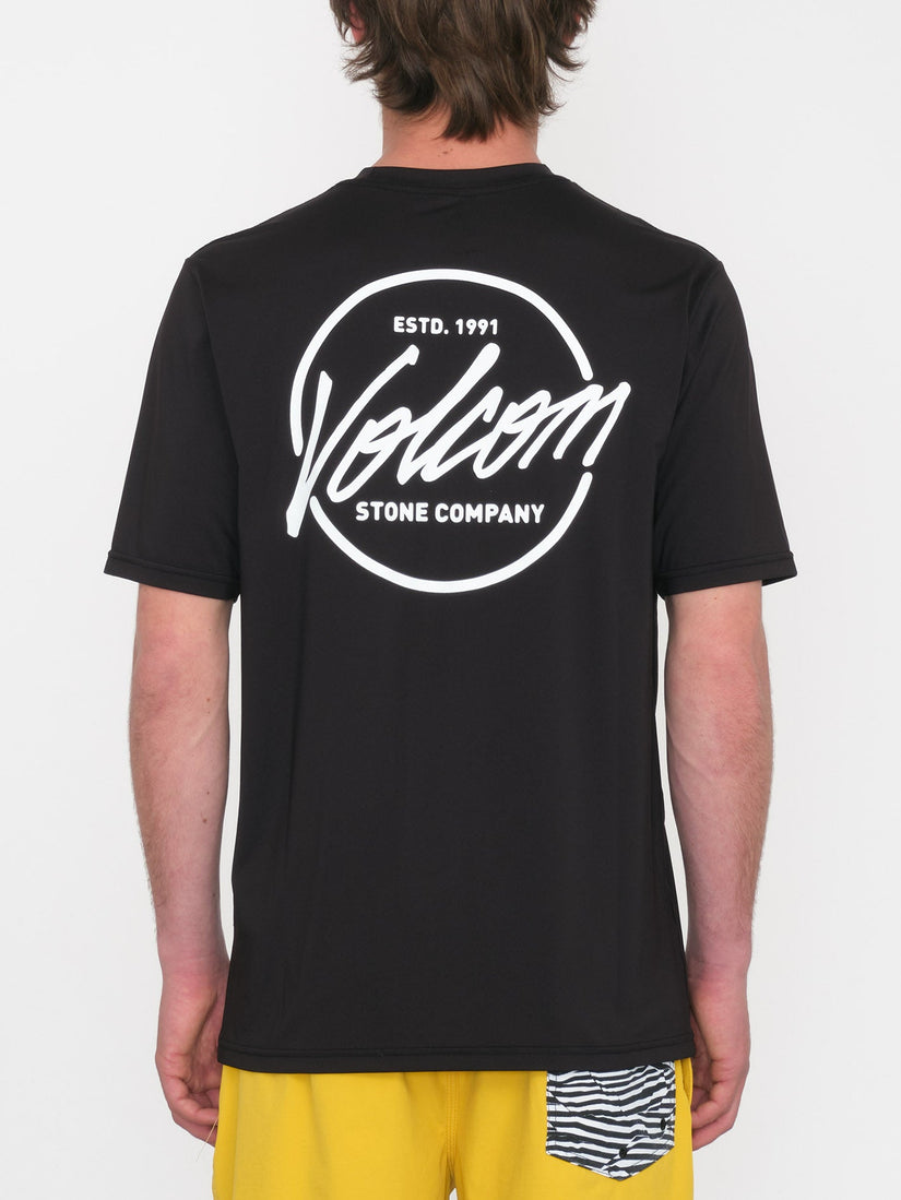 The Stone Stamp short sleeve UPF 50+ rashguard is designed for a loose fit, providing comfort and freedom of movement.